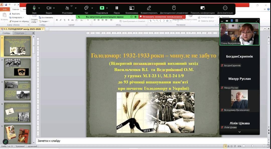 Захід підготували та провели Вєдєрнікова О.М. та Васильченко В.І., створивши змістовну та емоційно насичену зустріч, яка сприяла формуванню історичної пам’яті й громадянської свідомості здобувачів освіти.