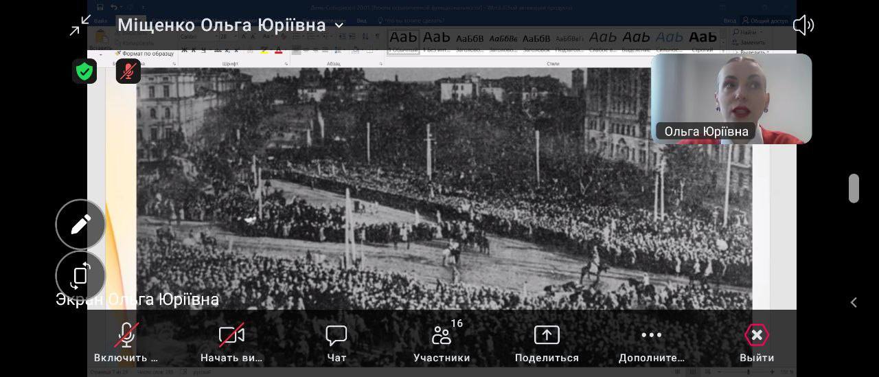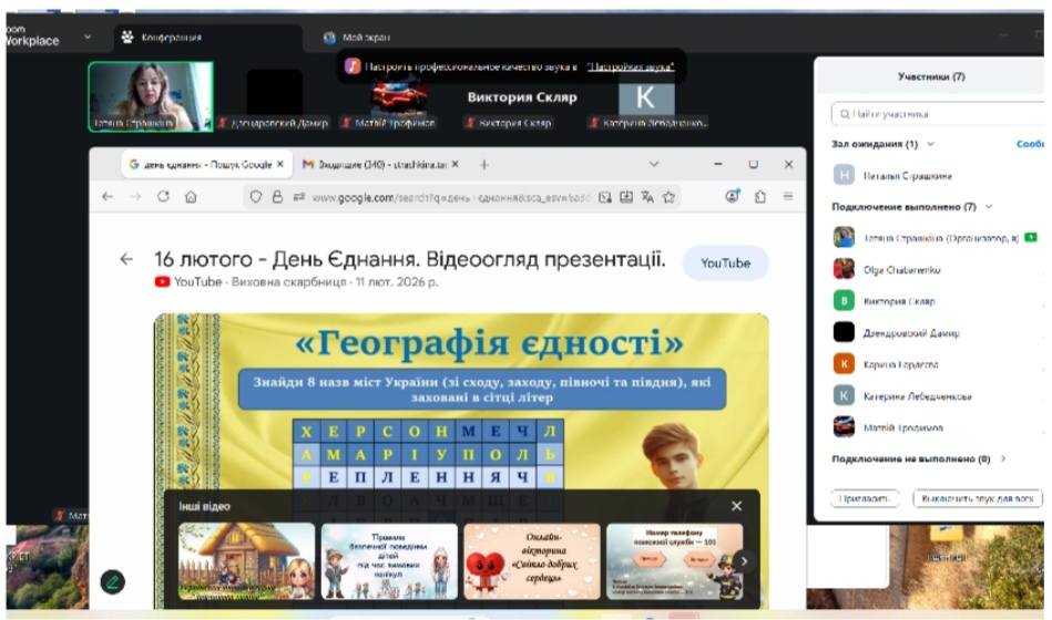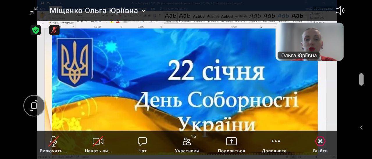 З нагоди відзначення державного свята Дня Єднання, здобувачами освіти І курсу, групи КТМ-24 1/9, 18.02.2025 р. у коледжі було проведено виховний захід “Сила народу – в єдності”, у форматі онлайн. Ідейним посилом проведення цієї онлайн-акції стало висвітлення особливого сенсу, якого набуло це свято в умовах війни – показати усьому світові, що українці сьогодні – як ніколи єдині у відстоюванні своєї незалежності та мирного майбутнього. На онлайн-конференції були присутні студенти першого курсу, викладачі коледжу.