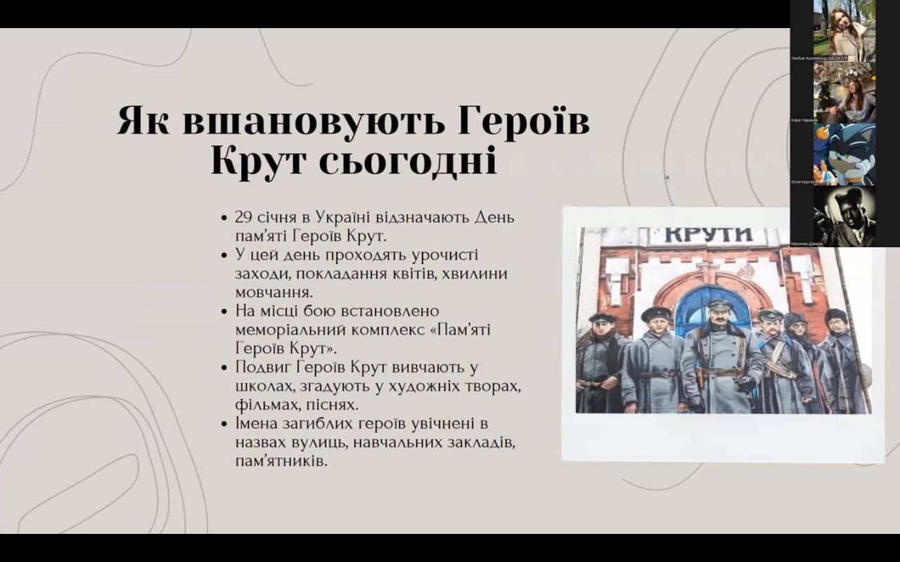 Під час заходу здобувачі освіти висвітлювали теми шани, пам’яті та глибокої поваги до українських героїв, які віддали своє життя за Батьківщину. Учасники ознайомили присутніх з історичними подіями бою під Крутами, наголосили на значенні цього подвигу для формування національної свідомості та патріотичних цінностей молоді.