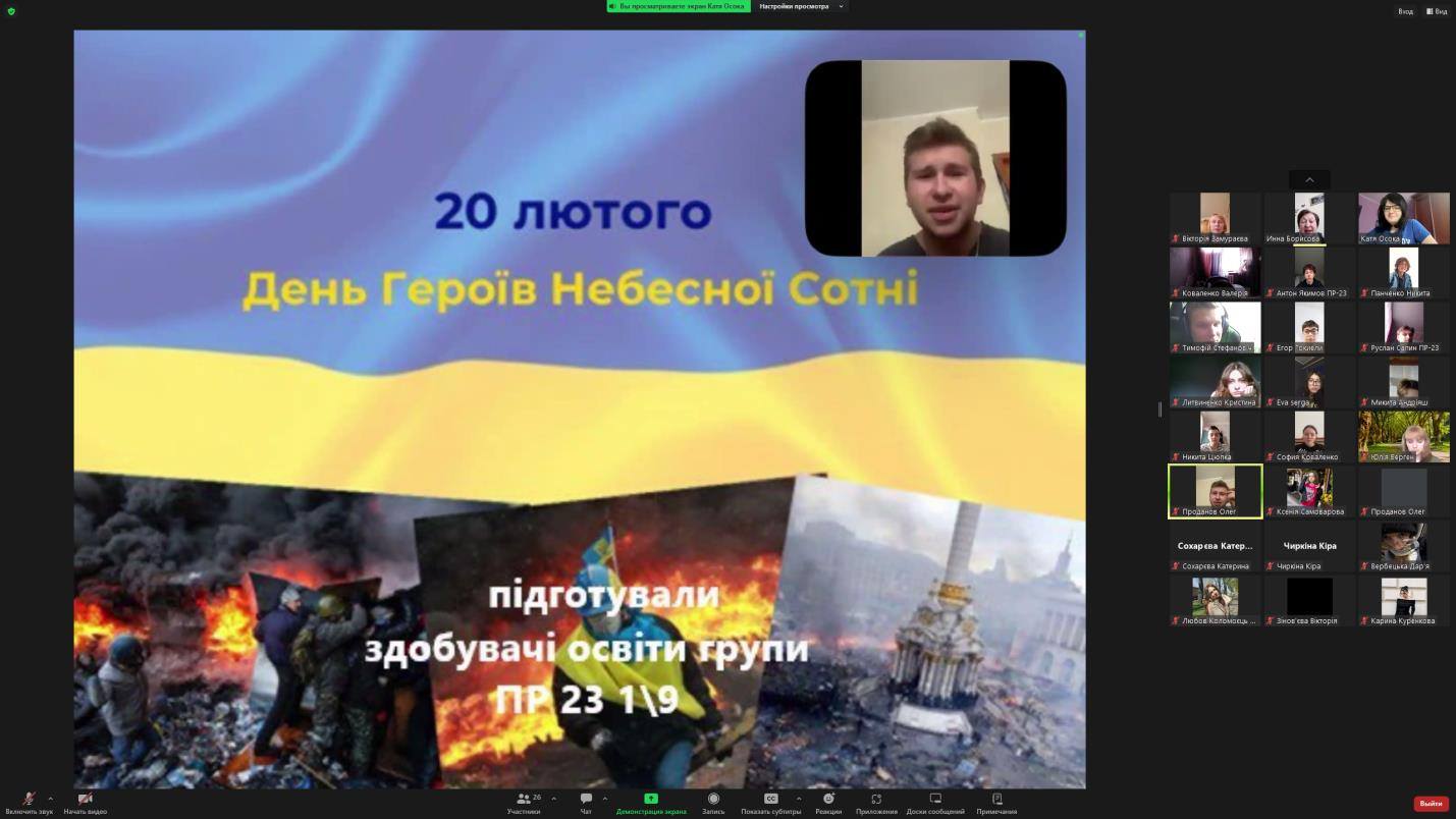 Цього дня група ПР-23 1/9 провела виховну годину, присвячену вшануванню подвигу Героїв Небесної сотні. У ході заходу згадали трагічні події Революції Гідності, схилили голови у хвилині мовчання та осмислили значення жертовності тих, хто віддав своє життя за свободу, незалежність і європейське майбутнє України.