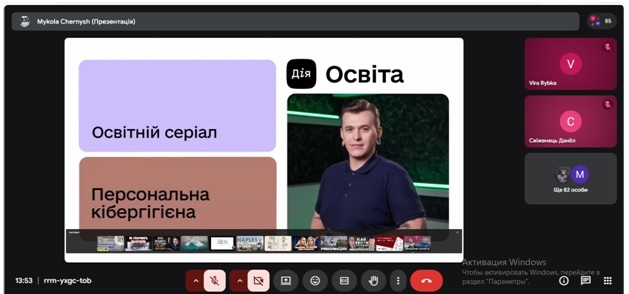 Під час онлайн-лекції обговорювалися питання кібербезпеки, захисту персональних даних, протидії кібербулінгу та онлайн-шахрайству, а також правила безпечної поведінки в соціальних мережах. Студенти ознайомилися з основними загрозами в інтернеті та способами їх уникнення, подивившись освітній серіал “Персональна кібербезпека” і пройшовши Квест “Гієна Гігієна й МереЖах” на порталі Дія.Освіта.